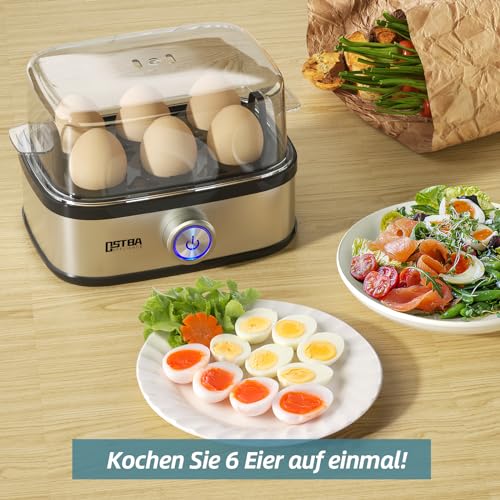 OSTBA Eierkocher Edelstahl, 400W Kompakter Eierkocher Multifunktional, 6 Eier leicht zu pellen, weich, mittel, hart gekocht, Eierbecher, Omelett-Maker, Dampfgarer, Signalton, Kontrollleuchte